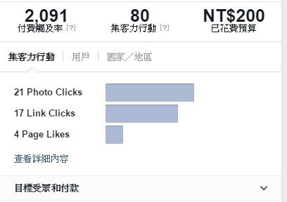 臉書附上網址連結,花了最低的一天兩百塊來測試一下成效